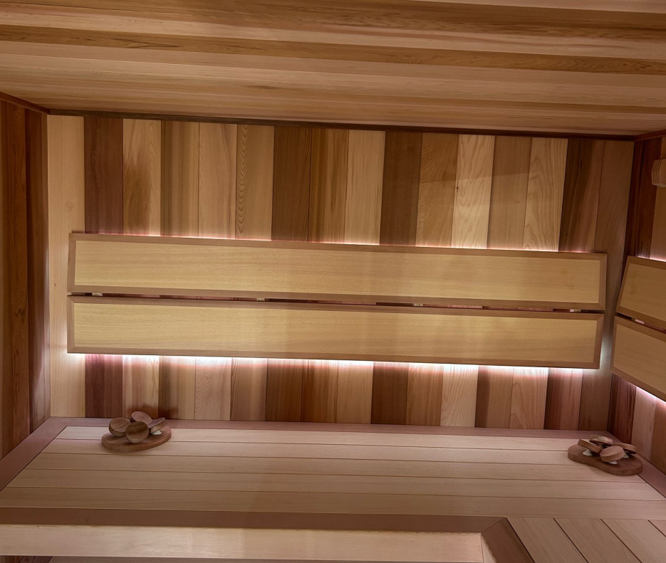 Základ celého interiéru tvoří široké palubky z kanadského cedru. Dřevo s výraznou kresbou a přirozeně teplým barevným tónem zde neplní jen estetickou roli. Cedr je známý svou stabilitou, příjemným povrchem a charakteristickou vůní, která se v teple jemně uvolňuje a stává se nedílnou součástí saunování. Právě tento nenápadný aromatický detail dodává hloubku prožitku celému rituálu , kterou nelze nahradit žádným technickým prvkem.