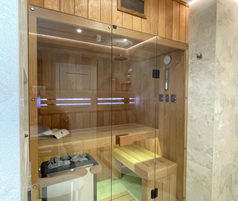 Všechny ovládací prvky jsou integrovány přímo do interiéru sauny, což výrazně zvyšuje komfort používání a zachovává čistý vzhled bez rušivých externích panelů. Ovládání je intuitivní a přehledné – přesně tak, jak by moderní sauna měla fungovat.