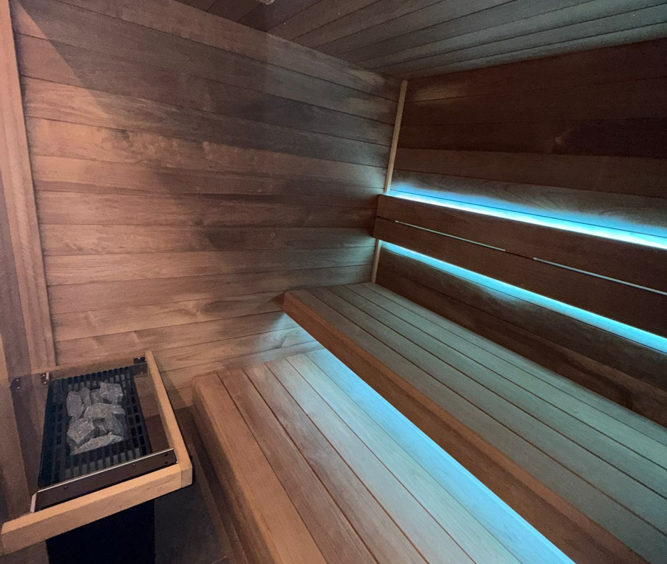 Veškeré vybavení – topidlo, infrazářiče, LED podsvícení opěrek zad ve dvou liniích, podsvícení horní lavice i vestavěné reproduktory – je integrováno do systému LOXONE. Sauna se tak stává součástí chytré domácnosti a lze ji ovládat stejně přirozeně jako ostatní technologie v domě. Bez dodatečných ovladačů, bez složitého nastavování.